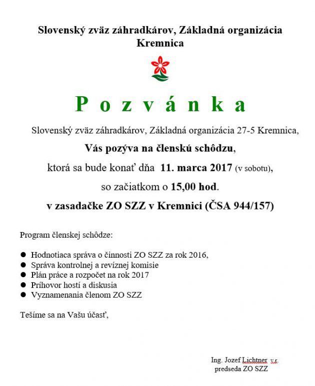 Záhradkári – MESTO KREMNICA https://oldkremnica.webyportal.sk Oficiálne stránky mesta Kremnica Fri, 03 Mar 2017 07:10:00 +0000 sk-SK hourly 1 Pozvánka na členskú schôdzu dňa 11. marca 2017 https://oldkremnica.webyportal.sk/2017/03/03/pozvanka-na-clensku-schodzu-dna-11-marca-2017/ https://oldkremnica.webyportal.sk/2017/03/03/pozvanka-na-clensku-schodzu-dna-11-marca-2017/#respond Fri, 03 Mar 2017 07:09:33 +0000 http://oldkremnica.webyportal.sk/?p=2849653